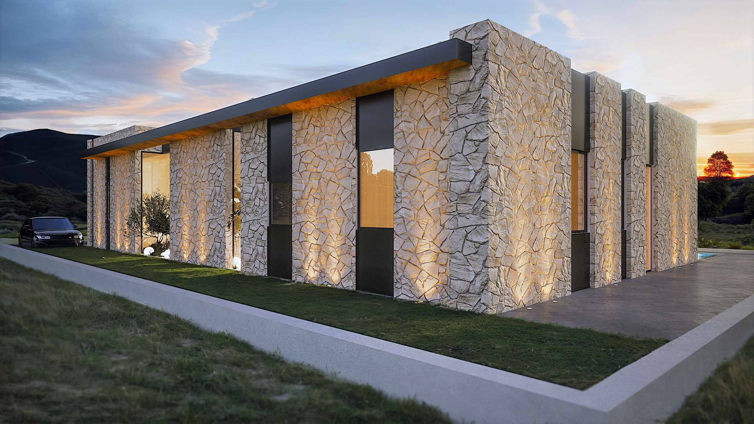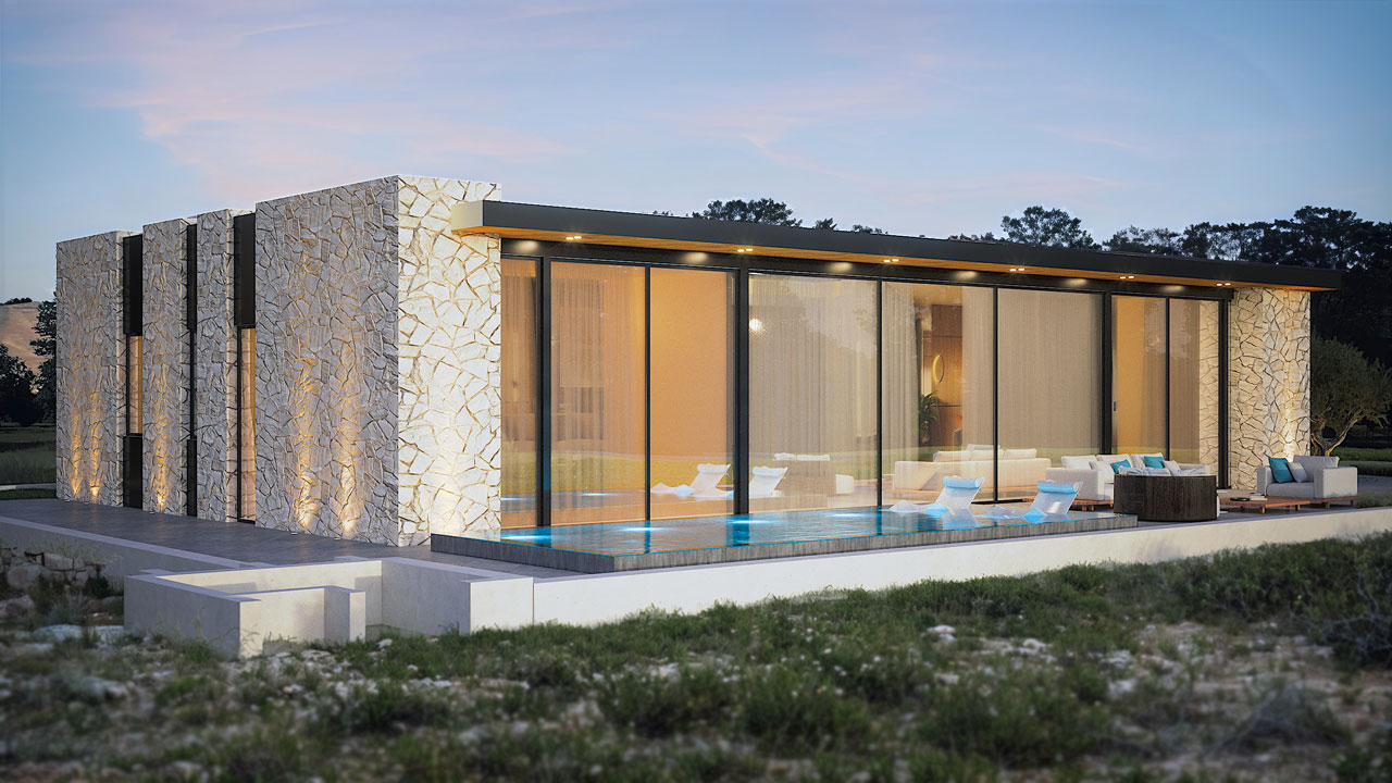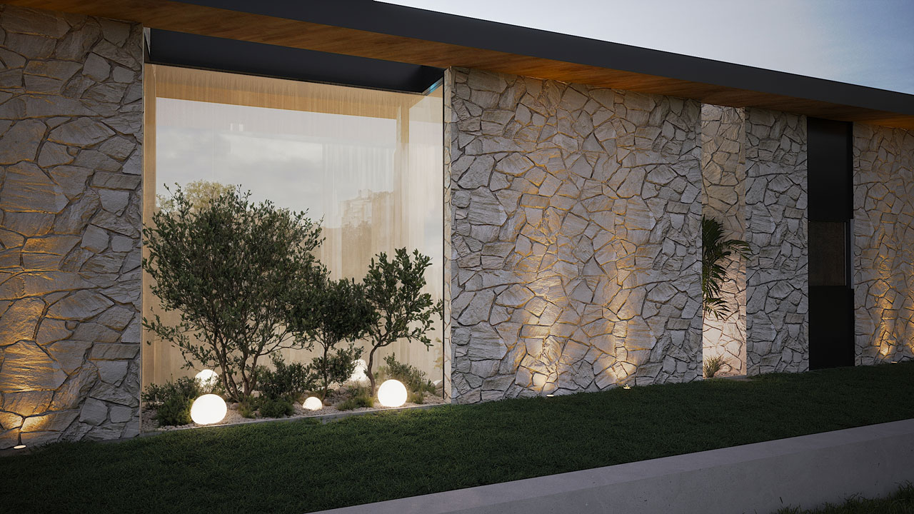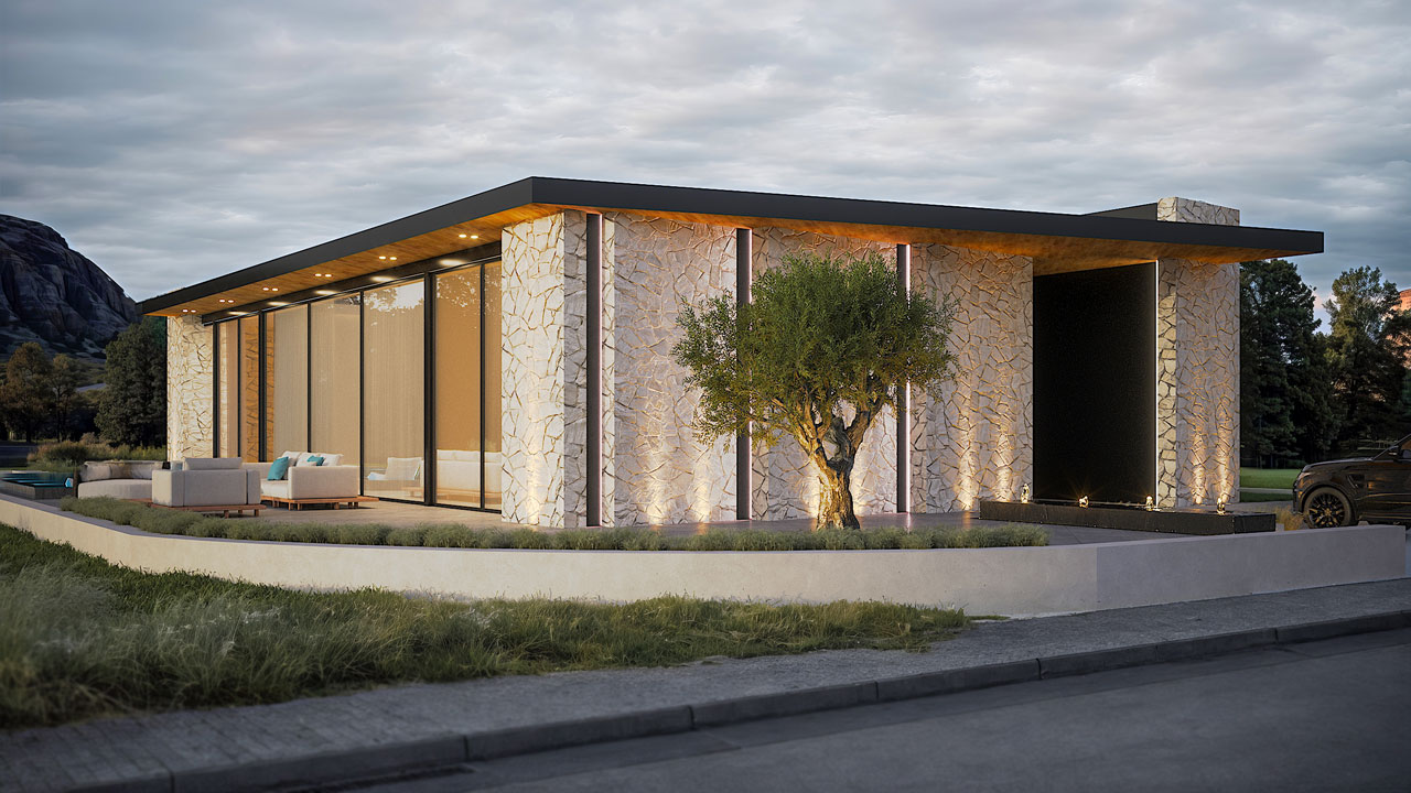 וילה מודרנית ונוכחת, בעלת אופי מאופק אך בטוח בעצמו. חזיתות הבית משלבות חומרים טבעיים- אבן גסה, עץ חם וטקסטורות עמוקות- שיוצרים חיבור ישיר לטבע, תחוזה חמה ואינטימית שמכניסה את החוץ פנימה כבר מהמבט הראשון.